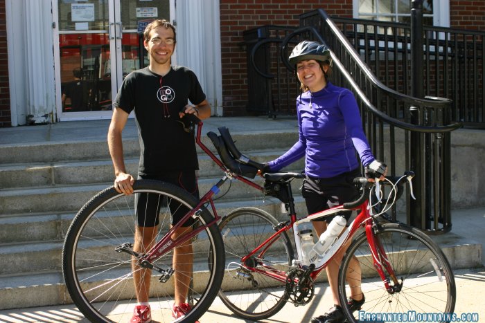 Home » Blog » 2011 » 06 Bob Across America in the Enchanted Mountains by Jeremy K on Jun032011 You ever have one of those days where you see someone or something and one part of your brain wants to stop while the another part of your brain wants to stay on task. Today was such a day as, on my way to work, I passed a bicyclist and a unicyclist with a camera on his helmet, on Route 242. After seeing that, I immediately wanted to stop and chat but I had to get to work. I went to work told several co-workers what I had seen and said that I would love to just talk with them. Blah blah blah, co-workers agreed that this was probably something special and off I went! Bob and Laura, two awesome people riding across America for the American Red Cross National Relief Fund through BobAcrossAmerica.com were hanging out at the stop light in Little Valley. As you can see from the photo, Bob rides a big unicycle and Laura rides a bicycle. They have been going up and down all the steep hills and windy roads from Portland, Maine and through New York on their way to Portland, Oregon. One of the stories that Laura and Bob had shared was about the only crash Bob has had so far on their trip across America. Bob had a monster mosquito attack his ankle and while Bob fought the mosquito off, he lost control of the unicycle and crashed helmet-first onto the ground. Bob's sister Annah is also a big part of the team as she keeps things in order for Bob and Laura and she keeps people updated. Laura and Bob had some great stories to tell and some may be seen at BobAcrossAmerica.com. They have met some great people on the way but have dealt with some negative people. Be sure to welcome Bob and Laura while they are passing through your part of the United States of America. So please pass some good vibes Bob and Laura's way by waving! I would love to see some video from Bob's helmet camera. I haven't found any video on Bob's site yet but they have bunches of photos. Also, note that Bob Tweets @unicyclebob You can donate to the American Red Cross National Relief Fund using the button below or on BobAcrossAmerica.com Donations are accepted online through the link above, or by check payable to: The American Red Cross 2401 Congress St. Portland, ME 04102. Don't forget to reference Bob Across America! Thank you so much. Have a great journey Bob, Laura and Annah! About Jeremy K I love running around in my bare feet and playing outside. Filed in Summer Adventure Bicycling Red Cross unicycle Ellicottville Little Valley Machias Napoli Randolph Yorkshire Login to post comments Email this page Photos tagged as #EnchantedMountains or #EMFun. @emountains
