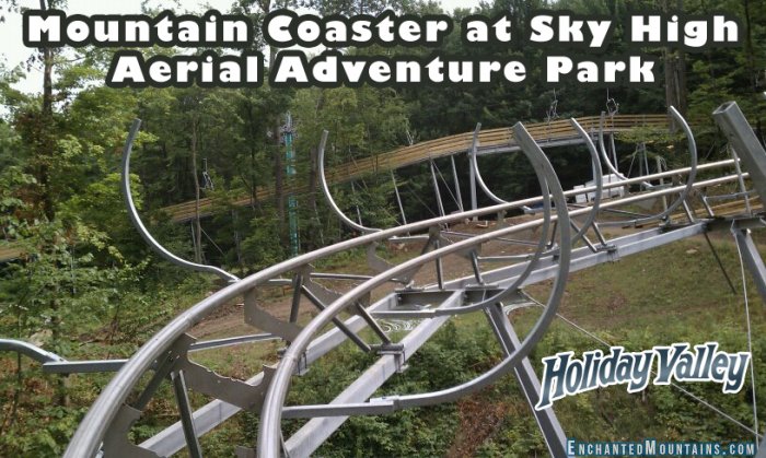 Home » Blog » 2011 » 08 Grand Opening of Holiday Valley's Mountain Coaster by Jeremy K on Aug172011 Get ready to scream with excitement this Saturday at the Grand Opening celebration of the Mountain Coaster at Holiday Valley’s Sky High Adventure Park. Be at Tannenbaum, Holiday Valley's West Side (where Sky High Aerial Adventure Park is located), on Saturday, August 20th at 10 a.m. with at least $6 in your hand for a ride on the coaster. From Holiday Valley's Press Release: The Mountain Coaster is similar to a roller coaster with cars that ride upon a track. One or two riders load a car and travel 1,865 feet up the hill parallel to the Spruce Lake lift. At the apex the car begins its thrilling 2,490 foot descent zigzagging and spiraling down through the woods. There are 15 curves, 12 waves, 2 jumps and a giant spiral along the length of the ride. The average grade is 15.2 percent with a maximum of 23.6 percent. Riders can accelerate or decelerate using handles on the sides of the car. The Mountain Coaster will operate daily through September 5th and then weekends through at least October 9th. The coaster will also operate during the winter season. The cost of a single ride is $6 during the summer season. Video: Test ride down part of the tracks See more at Holiday Valley's Sky High Adventure Park About Jeremy K I love running around in my bare feet and playing outside. Filed in Summer Adventure Ellicottville Login to post comments Email this page Photos tagged as #EnchantedMountains or #EMFun. @emountains