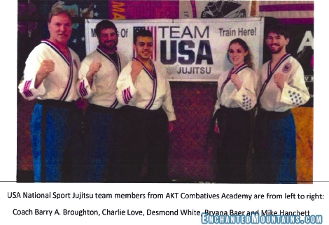 Home » Blog » 2017 » 06 Team AKT Members Earn Spots on Team USA by Jacquie on Jun062017 Team AKT Members Earn Spots on TEAM USA Five members of Team AKT from Olean's AKT Combatives Academy recently received Official Notification Letters of their selection as members of the USA National Sport Jujitsu team that will be competing at the World Championships in Australia in October of this year. Official letters came from Robert Stines, President of the American Jujitsu League (AJL) headquartered in Englewood, FL informing Team AKT members Charlie Love, Mike Hanchett, Desmond White and Bryana Baer that they were selected as members of the National Sport Jujitsu team, while Barry A. Broughton, owner of AKT Combatives Academy and Head Coach of Team AKT was named to the Team USA coaching staff. For the past four years members of Team AKT have competed in US Sport Jujitsu Association, AJL and Jujitsu America sanctioned tournaments throughout the country. A series of tryouts in Virginia and Columbus, OH have yielded the National Jujitsu team that will be representing the USA at the World Council of Jujitsu Organization's (WCJJO) World Championships being held on the Gold Coast of Queensland, Australia. The WCJJO has 32 member countries that are eligible to send teams to the world championships held October 26th-29th, 2017. "I cannot express how proud I am of these four individuals as they represent not only the USA, but also Olean and Western NY. Their hard work, dedication and perseverance has caused them to excel and reap great dividends," commented Grandmaster Broughton. "However, it would not be possible for them, if it were not for the assistance of fellow Team AKT members, the coaches and the support of their families," he continued. "When we formed Team AKT four years ago, my goal was to provide an opportunity for my students to test their acquired skills against world-class competitors, and to experience the comradery that is built between martial artists competing at national and international levels." The Sport Jujitsu format of competition most closely represented what students are taught at AKT Combatives Academies. Sport Jujitsu bouts consist of two 2-minute rounds of fast paced continuous sparring where competitors earn points for strikes, kicks, throws, takedowns, and submissions by chokes and joint locks. "Athletes are selected based on their demonstrated abilities in previous competitions, being coachable and their attitude" said Stines, Team USA Head Coach. Team USA will field a team of up to 20 Sport Jujitsu fighters and 20 grapplers, 4 coaches, 1 team physician and 1 team trainer. "Being selected for Team USA has been a huge eyeopener on what you can accomplish with hard work, and your willingness to take risks," states Desmond White. Mike Hanchett echoes the sentiment, saying "It's a surreal feeling to represent the USA and AKT Combatives. It's proof that if you have the right mindset and the proper work ethic, you can achieve your dreams. Being from a small town doesn't mean that opportunities don't exist. You just have to be willing to take the leap." Team USA members will be participating in monthly training camps in OH, NY, VA and TN throughout the year in preparation for the world championships. One of the Team USA training events will take place in conjunction with the 3rd Annual AKT Sport Jujitsu Classic tournament being held in Olean on April 22nd. Team member Bryana Baer states, "This is a feat I would not have imagined in my lifetime. I am so grateful for this opportunity." Charlie Love agrees. "Earning a place on Team USA has been very humbling. It's a tremendous honor to represent AKT, our instructor, our families, and our country. We are all representing something much bigger than ourselves." Because members of Team USA are amateur athletes and coaches, they are responsible for the financial obligations incurred with training and competing at the world championships. Expenses include air fare, lodging, ground travel, meals, and training gear. To assist in offsetting the nearly $20,000 needed by the five local team members, a fund raising campaign will begin this week. A fundraising team lead by Jess McFall will be seeking individual, corporate and civic sponsors as well as coordinating fundraising events over the next several months. If you would like to make a donation, Mr. McFall can be contacted at (716) 904-2653. The Greater Olean Area Chamber of Commerce is also assisting in fundraising efforts. A GoFundMe Campaign has also been set up at www.gofundme.com/AKT-TeamUSA. More information about the WCJJO World Championships can be found at www.wcjjo.org. To contact AKT Combatives Academy, please call 716-373-1050, visit them at 705 N. Union St. Olean NY, 14760 or email them at info [at] AKTCombatives [dot] com About Jacquie "Live in the Sunshine. Swim the Sea. Drink the Wild Air." - Emerson Filed in AKT Combatives Jujitsu Karate Team USA Login to post comments Email this page Photos tagged as #EnchantedMountains or #EMFun. @emountains