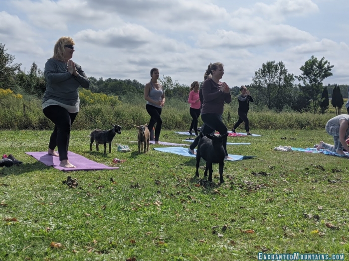 Home » Blog » 2020 » 09 "Bah-maste" - Goat Yoga at Canticle Farm by Danna Scharf on Sep152020 Yoga is the best exercise to connect our mind, body and soul. It helps us get to our natural state allowing our minds to be at peace. Now imagine doing yoga in the middle of a field surrounded by nothing but beautiful hills, feeling a breeze and hearing all of the sounds that nature has to offer. Sounds soothing already, right? I haven’t even added the best part yet, GOATS! Goats are so friendly, social and loving that it's the best animal therapy to combine with yoga. Once you start stretching on your mat and see the goats coming towards you, I promise that you won't be able to stop smiling. The goats have free reign to walk around while the yoga class is taking place. So that means that they’ll run, jump, and even stand by you or on you, which you'll be excitedly waiting for your turn. If they come up to you, you can take a moment to snuggle them because how could you not?! Have you never done yoga before or feel that yoga isn't for you? Don't worry because this is more than just a yoga class it's an unforgettable experience. Even if you're there more for the goats, yoga is a great exercise for everyone and you're in control of how intense you want it to be. You'll feel so welcomed by the instructor and the goats that once the hour long class is over you’ll feel so relaxed and happy that you won’t be ready to leave! Follow Lavender Lotus Yoga and Sweet As Sugar Goats on Facebook for upcoming classes. About Danna Filed in Autumn Adventure Canticle Farm Adventure Seekers Nature Lovers Login to post comments Email this page Photos tagged as #EnchantedMountains or #EMFun. @emountains