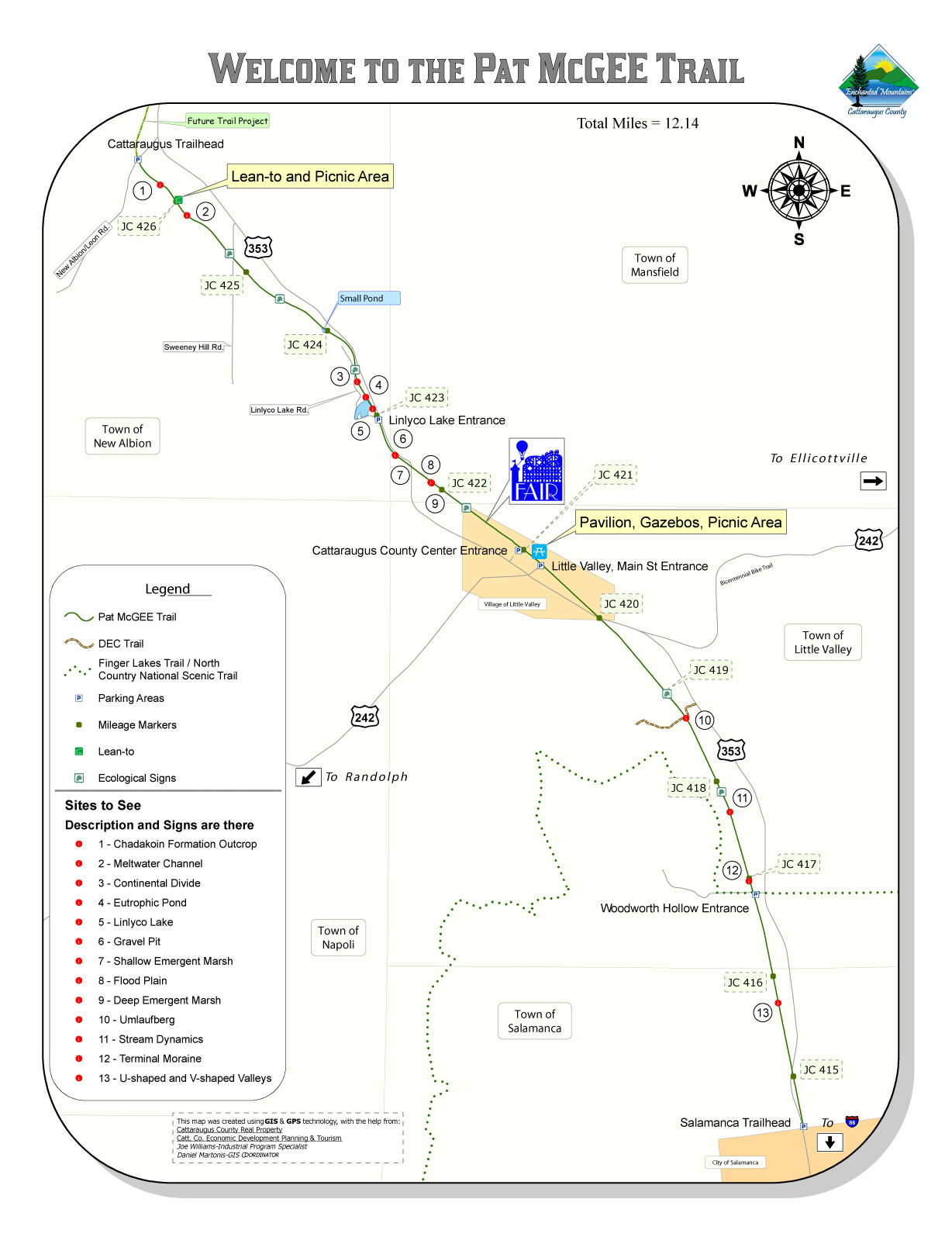 Home » Downloads » Map Pat McGee Trail Map Files Pat McGee Trail Map (revision 2006) File Size: 418.94 KB You can hike, bike, snowmobiling or ride horse on the Pat McGee Trail. This mile multi-purpose 12.2 trail will grow to be a county-wide system but at this time it connects 7 municipalities together (the Village of Cattaraugus to the City of Salamanca). Read more about the Pat McGee Trail on the Pat McGee Trail Page. Activities This file may help you with the following activities: Bicycling Hiking Horseback Riding Snowmobiling Updated on Wed, 12/12/2018 - 4:26pm. Categorized in Map Bicycling Hiking Horseback Riding Snowmobiling Login to post comments Email this page Photos tagged as #EnchantedMountains or #EMFun. @emountains