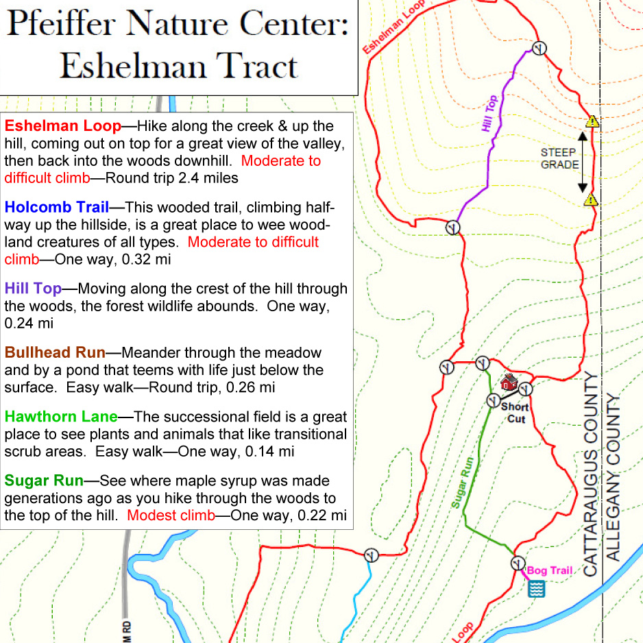 Home » Downloads » Map Pfeiffer Nature Center Eshelman Trails Map Files 2018 Map of the Eshelman Trails at Pfeiffer Nature Center File Size: 1.14 MB Map of the Eshelman Trails at Pfeiffer Nature Center File Size: 525.45 KB We can learn so much from nature at Pfeiffer Nature Center's Eshelman property. The attached map is of the Eshelman Tract of land listing the trails and geographic features. Pfeiffer Nature Center's Eshelman Tract has the following trails: Eshelman Loop - Hike along the creek & up thehill, coming out on top for a great view of the valley,then back into the woods downhill. Moderate todifficult climb - Round trip 2.4 miles Holcomb Trail - This wooded trail, climbing halfwayup the hillside, is a great place to wee woodlandcreatures of all types. Moderate to difficultclimb - One way, 0.32 mi Hill Top - Moving along the crest of the hill throughthe woods, the forest wildlife abounds. One way,0.24 mi Bullhead Run - Meander through the meadowand by a pond that teems with life just below thesurface. Easy walk - Round trip, 0.26 mi Hawthorn Lane - The successional field is a greatplace to see plants and animals that like transitionalscrub areas. Easy walk - One way, 0.14 mi Sugar Run - See where maple syrup was madegenerations ago as you hike through the woods tothe top of the hill. Modest climb - One way, 0.22 mi If you have any questions please contact us. Activity These files may help you with the following activity: Hiking Updated on Wed, 12/12/2018 - 4:51pm. Categorized in Map Summer Hiking Login to post comments Email this page Photos tagged as #EnchantedMountains or #EMFun. @emountains