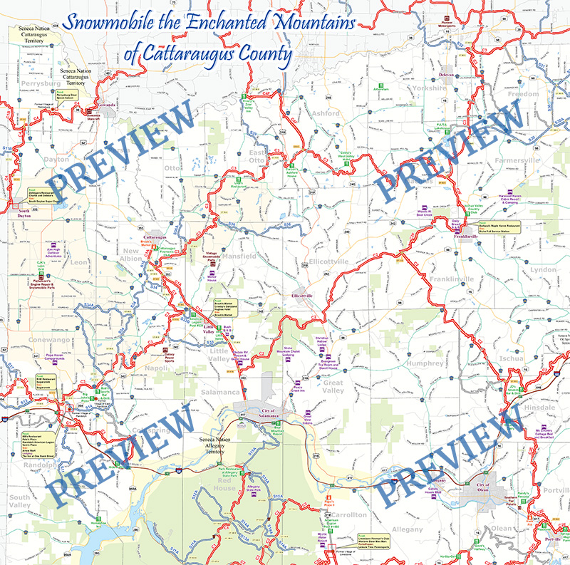 Home » Downloads » Map Snowmobile Trails Map Files Cattaraugus County Snowmobile Trails Map 2020-2021 File Size: 3.81 MB Cattaraugus County Snowmobile Trails Map 2019-2020 File Size: 3.18 MB Cattaraugus County Snowmobile Trails Map 2018-19 File Size: 3.22 MB Cattaraugus County Snowmobile Trails Map 2017-2018 File Size: 2.8 MB Cattaraugus County Snowmobile Trails Map 2016-17 File Size: 3.2 MB Cattaraugus County Snowmobile Trails Map 2015-2016 File Size: 2.15 MB Cattaraugus County Snowmobile Trails Map 2013-2014 File Size: 2.78 MB Cattaraugus County Snowmobile Trails Map 2013-2014 File Size: 2.98 MB Cattaraugus County Snowmobile Trails Map 2012-2013 with Layers File Size: 1.84 MB 2011-2012 Cattaraugus County Snowmobile Trails Map File Size: 1.25 MB 2010-2011 Cattaraugus County Snowmobile Trails Map File Size: 3.06 MB Cattaraugus County Snowmobile Trails Map 2009-2010 File Size: 2.93 MB Cattaraugus County Snowmobile Trails Map 2008 File Size: 2.62 MB This map's Print Size is 24" x 24" (but you can print it in any size you need) Check our Snowmobiling page for Trail Conditions We have over 450+ miles of snowmobile trails in Cattaraugus County. Download the map in PDF or download files for your GPS device! The Pat McGee Trail (12.2 miles) is a major segment of the Cattaraugus County trails system going from the Village of Cattaraugus to the Northern part of Salamanca. Allegany State Park contains over 74 miles of snowmobile trails. Request a FREE Snowmobile Trails Brochure! Activity These files may help you with the following activity: Snowmobiling Updated on Wed, 12/30/2020 - 11:31am. Categorized in Map Snowmobiling Adventure Seekers Login to post comments Email this page Photos tagged as #EnchantedMountains or #EMFun. @emountains