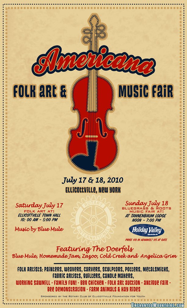 Home » Events Americana Folk Art and Music Fair Event Date(s): Sat, 07/17/2010 - 10:00am - Sun, 07/18/2010 - 7:00pm Please note that this event has expired! The 2010 Americana Folk Art and Music Fair is a two day Family event with arts, music and food in the Ellicottville town square Saturday, and at Holiday Valley on Sunday. The Rotary Club of Ellicottville, Foundation for Youth presents the 5th annual Americana Folk Art and Music Fair (Former Farm Fair) to instill the spirit of creativity in children and adults alike. This year’s event will have more of the hands on demonstrations to capture the spirit of the artistic community that makes up the Ellicottville and the Enchanted Mountains area. Saturday 10AM - 5PM Folk Art & Blue Mule Band at the Ellicottville Town Hall Painters, Weavers, Carvers, Sculptors, Potters, Metalsmiths, Fabric Artists, Quilters, Candle Makers Working Sawmill, BBQ Chicken, Folk Art Auction, Antique Fair, Bee Demonstration, Farm Animals & Hay Rides Sunday 12PM - 7PM Bluegrass & Roots Music Fair at the Tannenbaum Lodge at Holiday Valley Featuring The Doerfels Blue Mule, Homemade Jam, Zazoo, Cold Creek and Angelica Grim Tickets are $10 in advance through Holiday Valley (716-) or $15 at the gate. Kids under 12 accompanied by parents are free Download the poster for the 2010 Americana Folk Art & Music Fair For more information on this event please visit http://www.ellicottvilleny.com/index.php/events/view_event/6 This event will be held at: Village of Ellicottville Ellicottville, NY 14731 United States 42° 15' 43.5852" N, 78° 41' 7.8756" W Website: http://www.ellicottvilleny.com/index.php/events/view_event/6 Javascript is required to view this map. Event Categorized in Summer Festival Family Entertainment Crafts & Artisans Email this page Photos tagged as #EnchantedMountains or #EMFun. @emountains