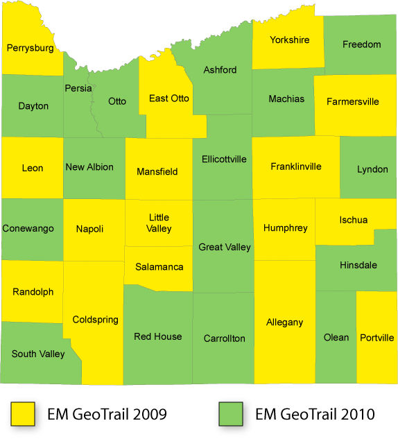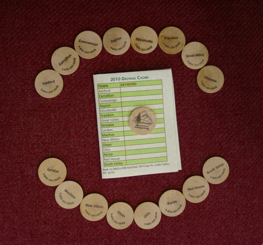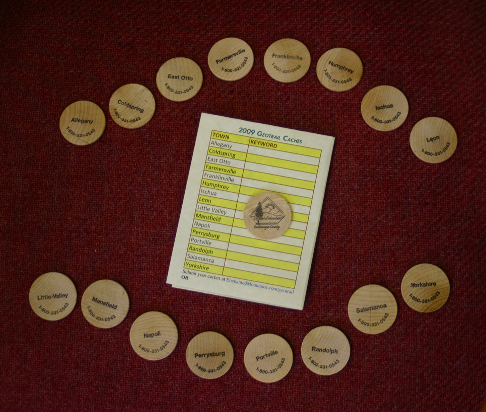 Home » Trails Enchanted Mountain GeoTrail in Western New York - CLOSED! The Enchanted Mountains of Cattaraugus County offers something for all seasons. Horseback riding and fishing in the spring, hiking and camping in the summer, hunting and scenic beauty in the fall, skiing and snowmobiling in the winter, and of course, geocaching all year round are just some of the great attractions to the area. Try out the NY Amish GeoTrail Part 1 NY Amish GeoTrail Part 2 launched on May 15, 2014!!! Important: The EMGT closed on October 21, 2013! See the blog post EMGT is Ending. Find all of the Enchanted Mountains GeoTrail (EMGT) Caches in Cattaraugus County's 32 towns in 2 years. For each town cache you find you will receive that town's wooden nickel. When a person has collected all 32 wooden nickels you may request the geocoin that is available (see photos below). All EMGT geocaches are officially registered with Geocaching.com. Participants will need to be registered on Geocaching.com to retrieve the coordinates and other location information. Registering on Geocaching.com is free. How to Get Started Before setting out to find caches, you may want an official leaflet (Request a Leaflet or Download). Leaflets are free and can be obtained at the starter cache as well as the County Building in Little Valley. Each cache will have a unique keyword written on the inside of the cache container's lid. Write this keyword down next to the town name in your leaflet. You will then either mail the list of town and keywords to the address listed above OR simply fill out the on-line form with your latest cache(s) and we will send you your wooden nickel. You may also stop in to the Tourism office at the County Building during business hours to obtain your nickels. Leaflets are the property of the cacher to retain as a keepsake, so any leaflet's mailed in, will be returned with your wooden nickel(s). What to do if you can not locate a cache If you find a geocache too difficult to locate be sure to take a photo from a spot along the way to your attempt at locating the geocache. Simply Email your photos to us at photos [at] EnchantedMountains [dot] com with the name of the geocache(s) you were attempting to locate, your name and mailing address. Or do that on the EMGT cache submission form. Archived caches Update Important: The EMGT is closed! See the blog post EMGT is Ending. For the archived Coldspring EMGT Geocache, we now ask cachers to go to the coordinate and get a picture of themselves and the view at Friends Boatlaunch. Email your photos to us at photos [at] EnchantedMountains [dot] com with the title "Photos from near Coldspring Geocache" and in the body be sure to put your name and mailing address so that we may mail you the Coldspring Geocache Coin. There will be a total of 32 (26) towns to visit, with half of the caches being placed in 2009 and the other half being placed in 2010. Successful collection of all 32 (26) wooden nickels will entitle the cacher to a special commemorative Cattaraugus County GeoCoin. Update Important: The EMGT is closed! See the blog post EMGT is Ending. Updated on Mon, 05/11/2015 - 3:58pm. Categorized in Autumn Spring Summer Login to post comments Email this page Photos tagged as #EnchantedMountains or #EMFun. @emountains