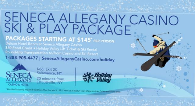 Home » Travel Packages Seneca Allegany Casino Ski & Play - Slopes Starting at: $145.00 Sorry but the travel package Seneca Allegany Casino Ski & Play - Slopes may no longer be available (12/22/2010 - 03/31/2011). Please check our other travel packages. Stay at the Seneca Allegany Casino and ski at Holiday Valley Resort. Holiday Valley Resort is located in the charming ski town of Ellicottville, New York - just 20 minutes from the Seneca Allegany Casino. Promo Code: "Slopes"$145 per person, double occupancy requiredIncludes: one deluxe king or deluxe queen room $50 Food credit Holiday Valley Lift Ticket ski equipment rental transportation to and from Seneca Allegany Casino and Holiday Valley Visit SenecaAlleganyCasino.com/holiday for reservation information. Categorized in Winter Email this page Photos tagged as #EnchantedMountains or #EMFun. @emountains